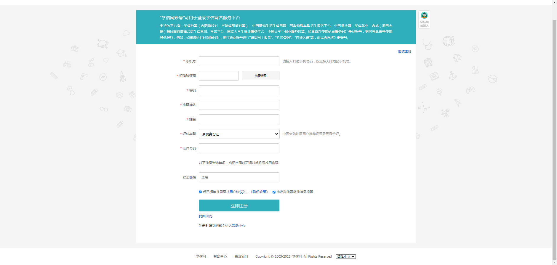 4、如没注册过学信网账号,请点击“注册学信网账号”,填写注册的手机号,密码,姓名,证件类型及号码等。(注意:标*号的都需要填写!不带*的可自行选择是否填写。)